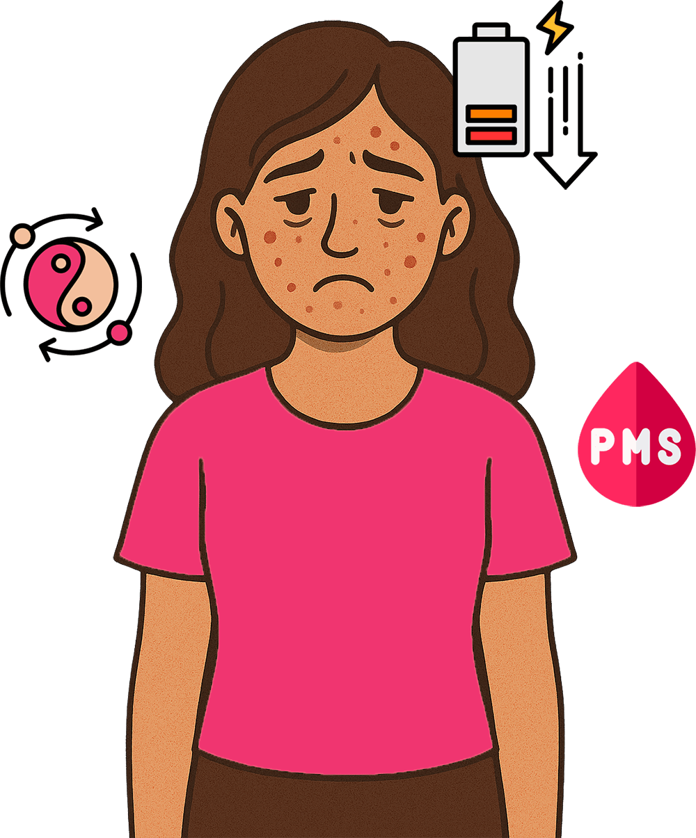 hangulatingadozások, szorongás, görcsök, fájdalmak, mellfeszülés, pattanások, puffadás, fejfájás/migrén, stb.